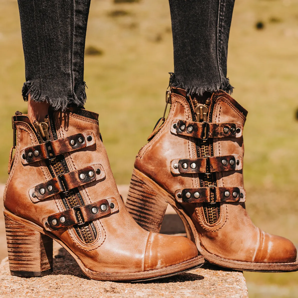 Find The Perfect Stride In Beckett. This Leather Ankle Bootie Features Symmetrical Embellished Straps, Round Toe, And Working Back Zip Closure. Completed With A Stacked Wooden Heel, Beckett Is A Stylish, Yet Functional Statement. Leather Upper, Leather Lining, Leather Sole Handcrafted In Mexico 3 ¼” Heel Height 5″Shaft Height 11½” Shaft Circumference Measurements Taken From Us Size 8