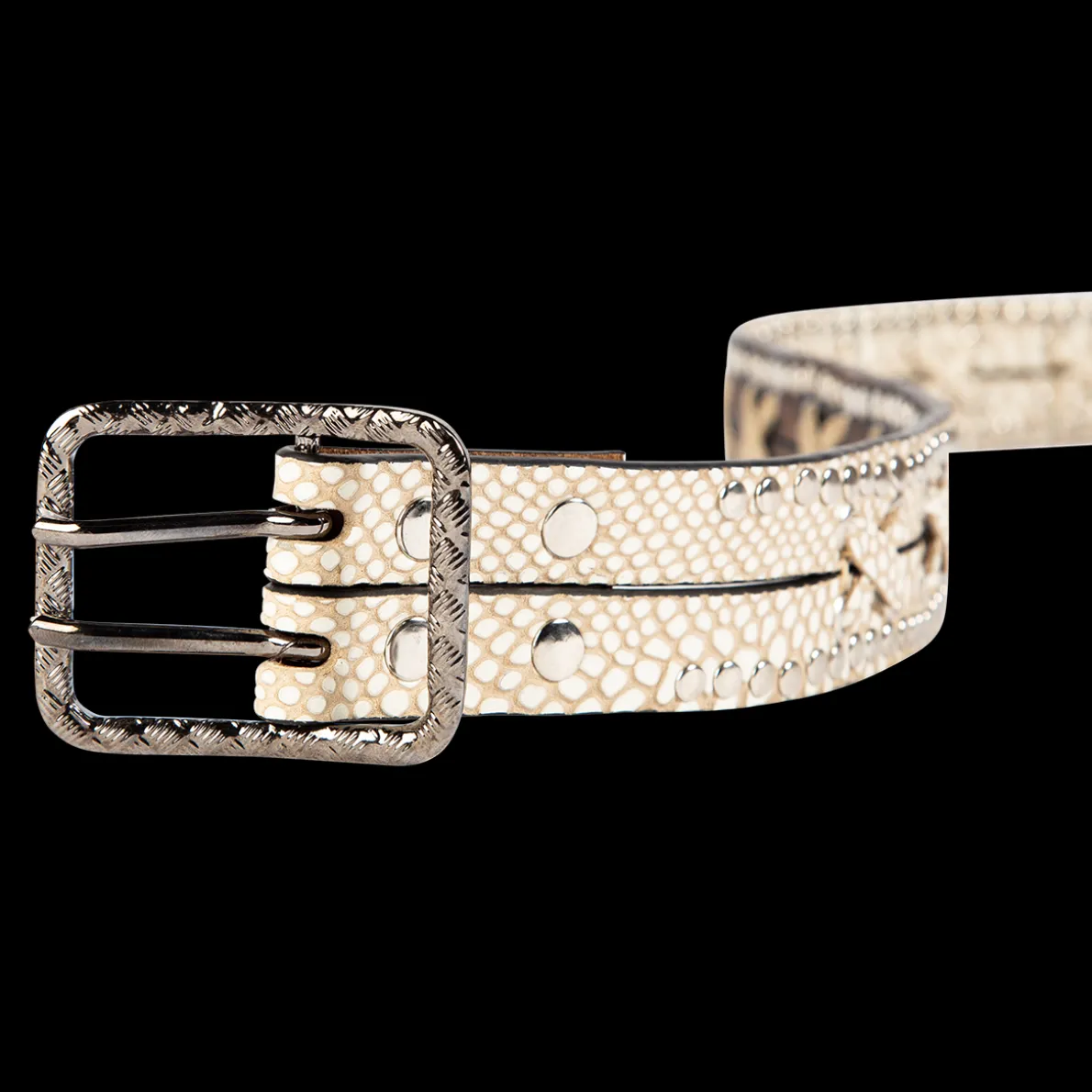 This Belt Is Unmatched With Its Stud Detailing And Criss-Crossing Leather Construction. Paired Perfectly With Rustic Hardware And Finished With A Double-Prong Buckle.Handcrafted In Mexico With 100% Full-Grain Leather. 1 ½”Strap Width 2 ¼”Buckle Height 40″ Full Belt Length 32″First Hole Measurement 36″Last Hole Measurement 1″ Spacing Between Holes Measurements Taken From Size Medium