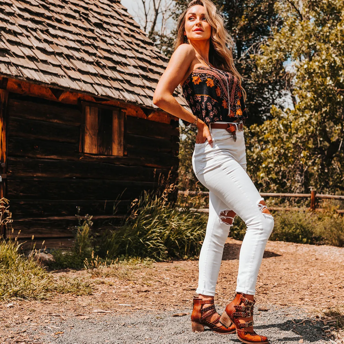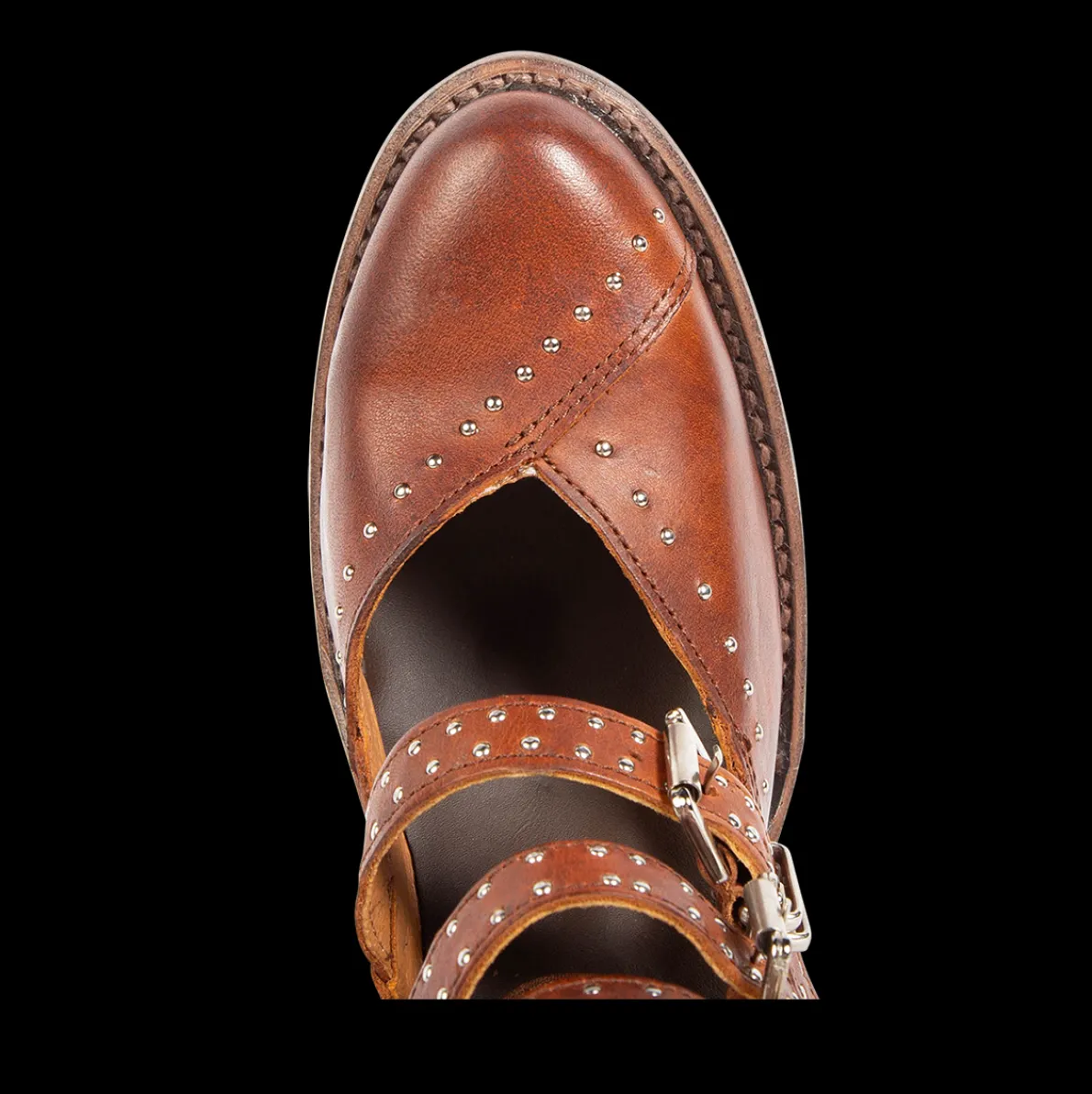 Felicity’s Elegant Western Structure Is Adorned With Silver Stud Embellished Leather And Adjustable Straps For The Perfect Customizable Fit. Finished With A Working Back Brass Zip And Almond Toe, This Open Construction Shoe Isready For Any Occasion. Leather Upper, Leather Lining, Leather Sole Handcraftedin Mexico 2¼”Heel Height 4¾” Shaft Height Adjustable Shaft Circumference Measurements Taken From Us Size 8