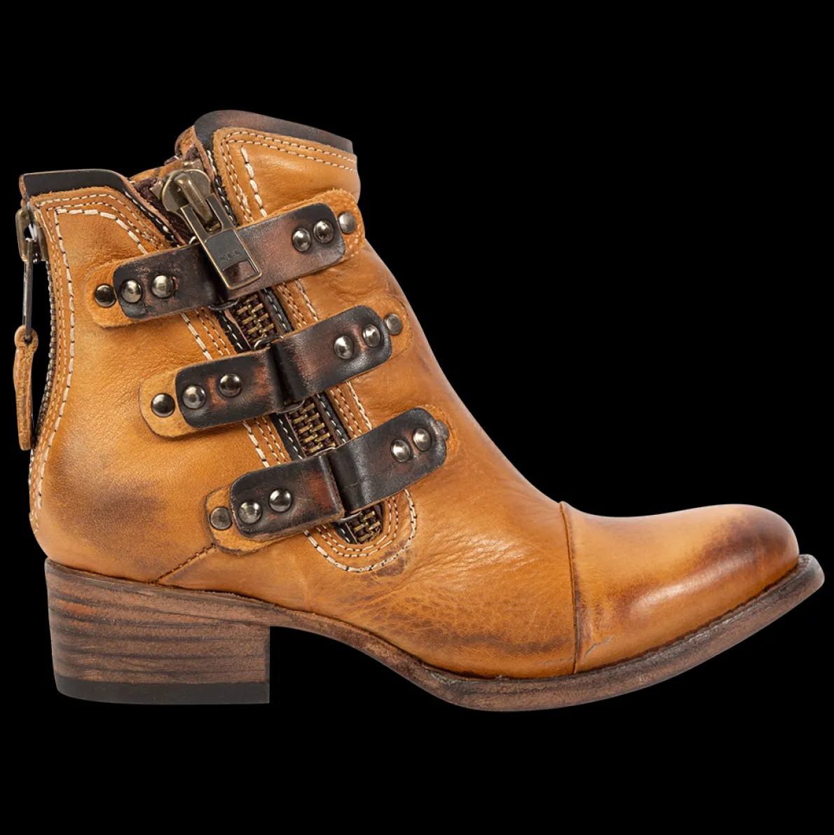 Step Out In Style With Grecko. This Low Heel Bootie Features Symmetrical Studded Straps, A Functioning Heel Brass Zip Closure, And Round Toe For Comfort. Keeping You On The Go All Season Long.