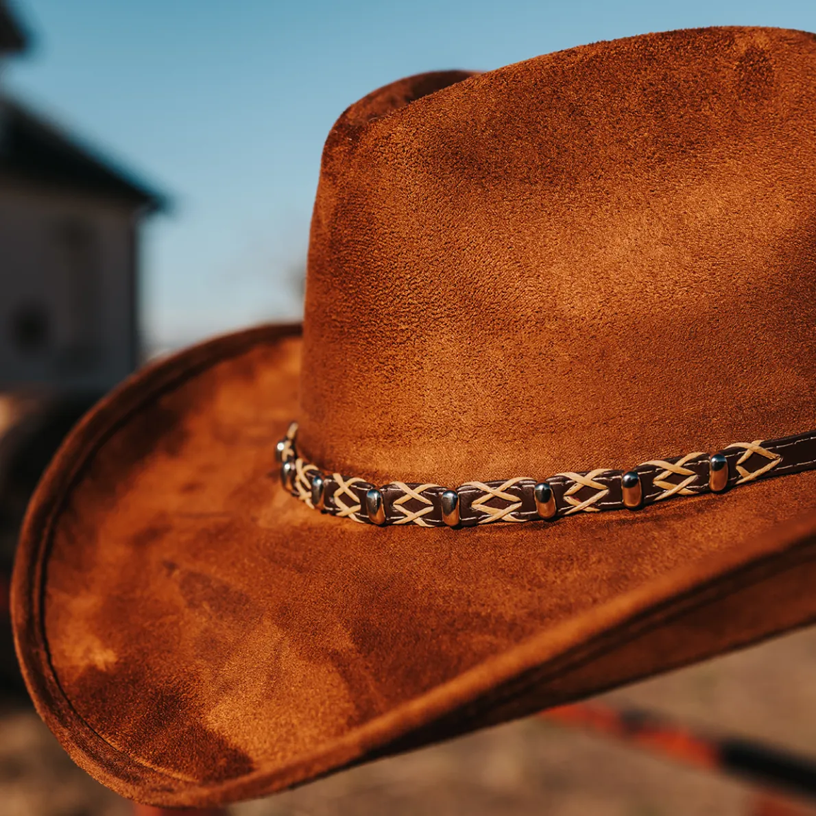 Paying Homage To Western Style, Jones Was Designed With An Upturned Wide Brim And Teardrop Crown. This Hat Features A Braided Leather Band For Added Texture And An Elastic Sweatband For Comfortable Wear.