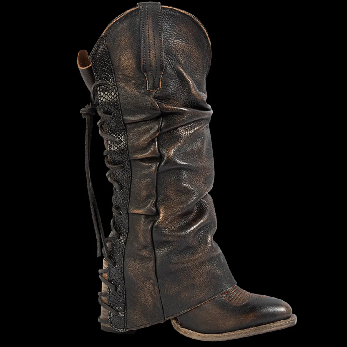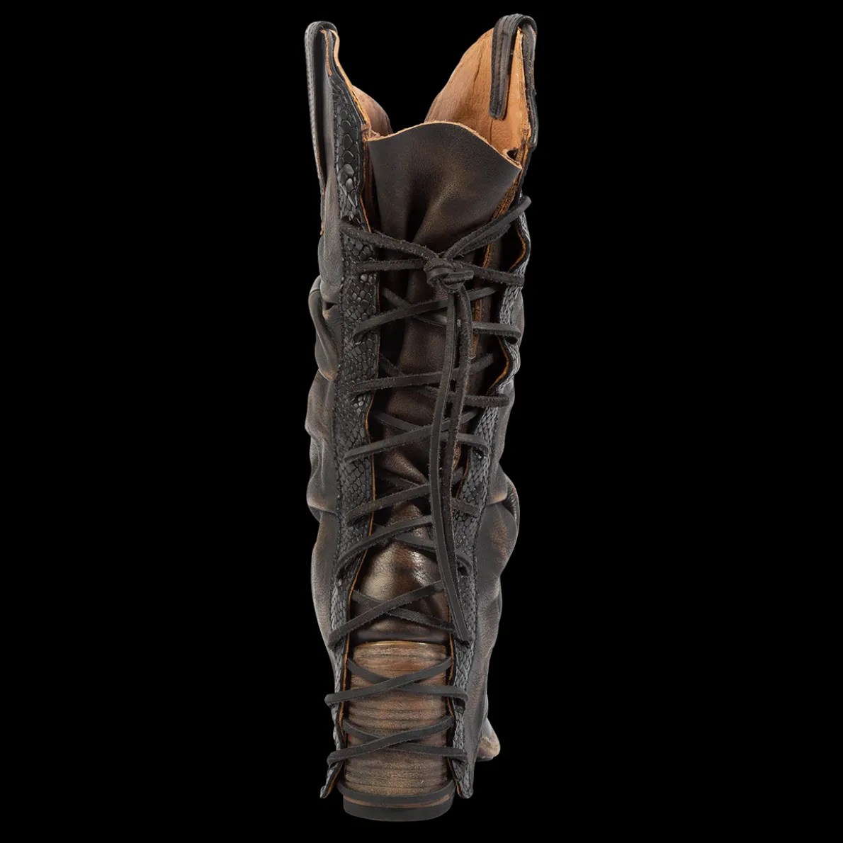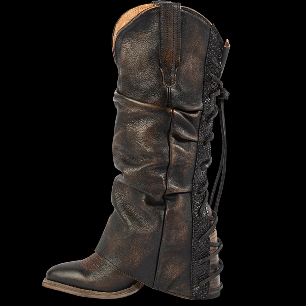 Designed With A Decorative Overlay, Jules Is Crafted With A Relaxed Silhouette And Features Anexpandable Contrasting Back Lace Panel. This Detailed Tall Boot Showcases A Pointed Toe With Traditional Stitching And Stands Upon An Elevated Flare Heel. Leather Upper, Leather Lining, Leather Sole Handcrafted In Mexico 3 ½”Heel Height 13 ¼”Shaft Height 18″ Adjustable Shaft Circumference Measurements Taken From Us Size 8