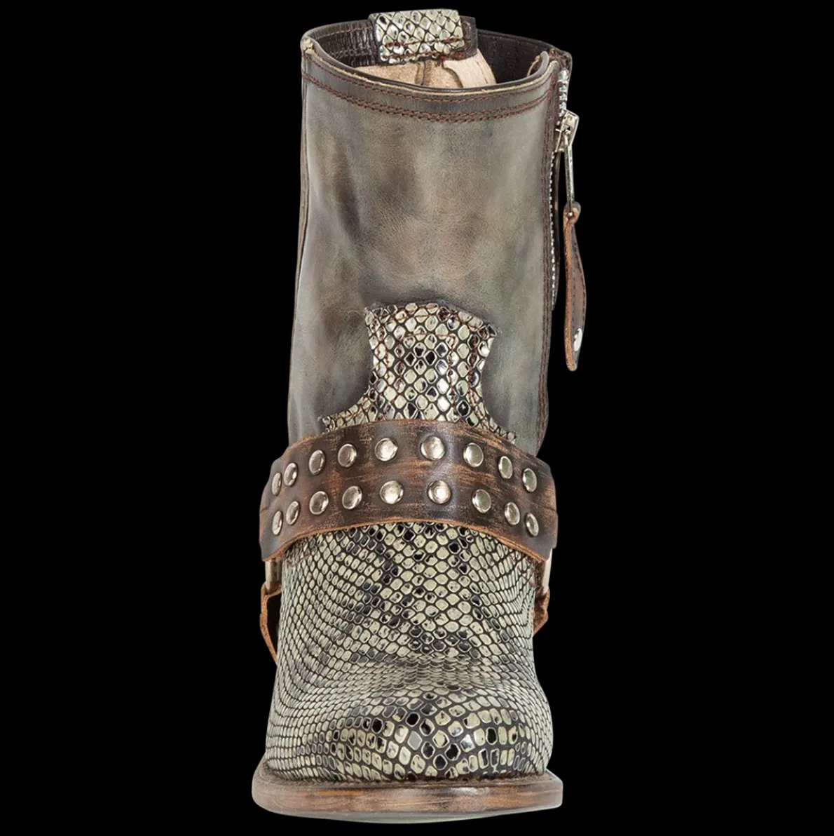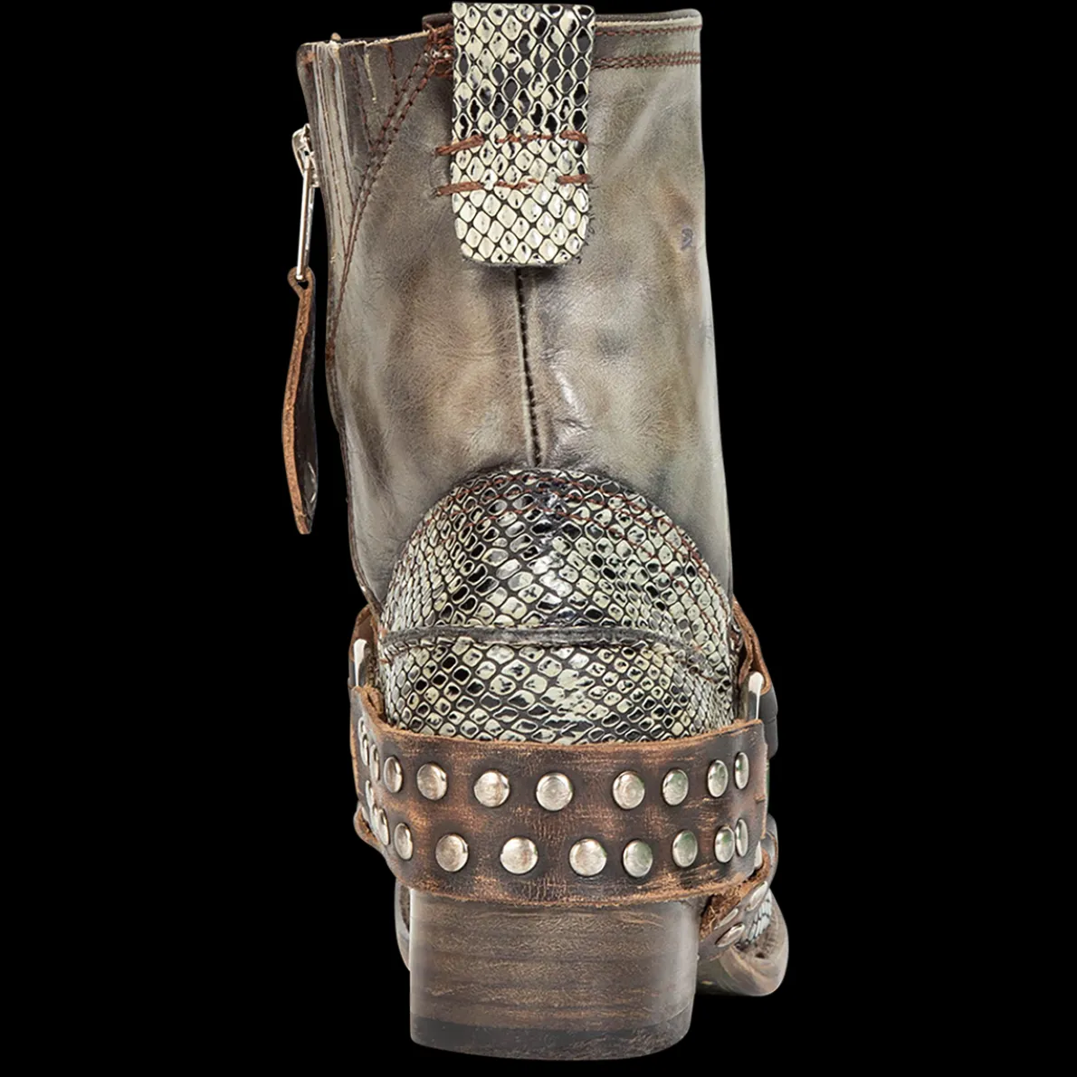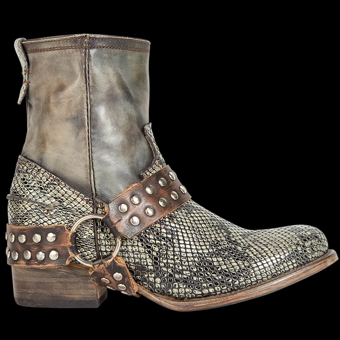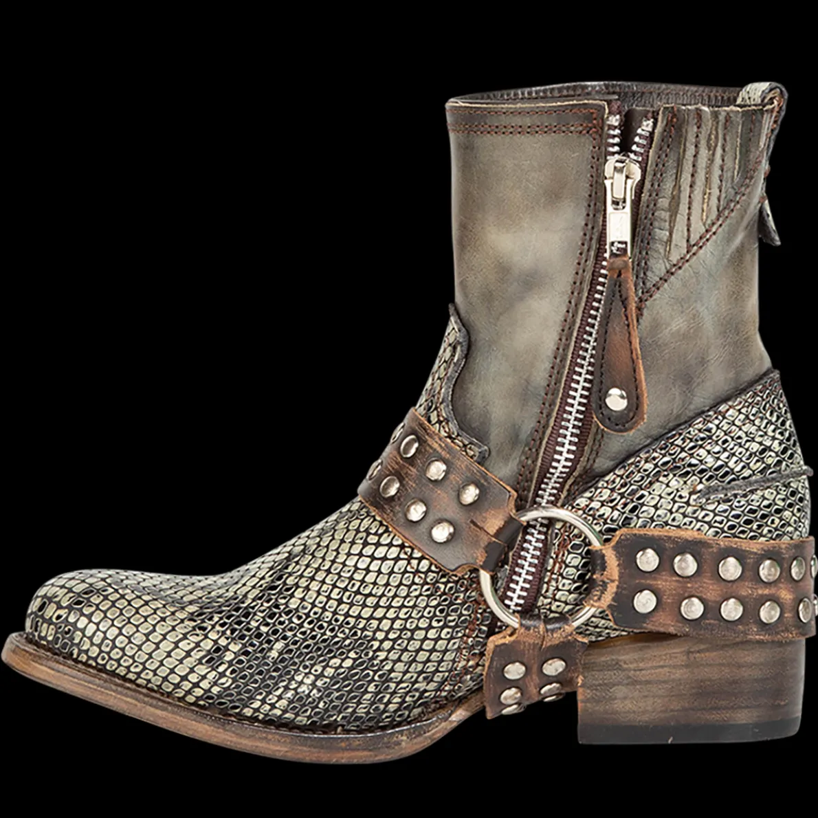 Ramone Is “Wanted” For Beingbold And Rebellious. This Full-Grain Leather Ankle Bootie Is Constructed Witha Western Shaft Crown, An Inside Zip Closure, And Paired With An Outside Welt. Finished With An Embellished Harness, Making Ramone A High Reward Item.