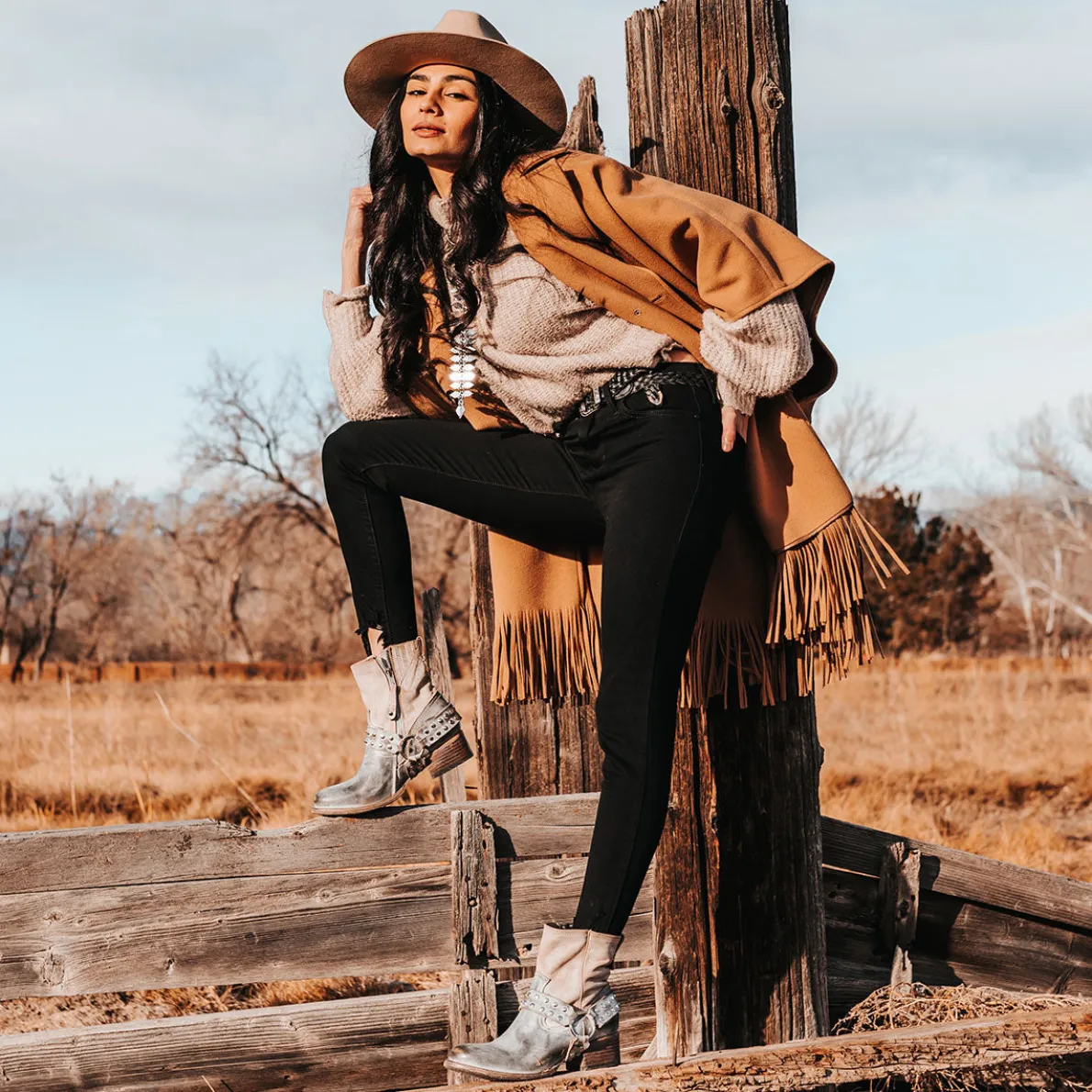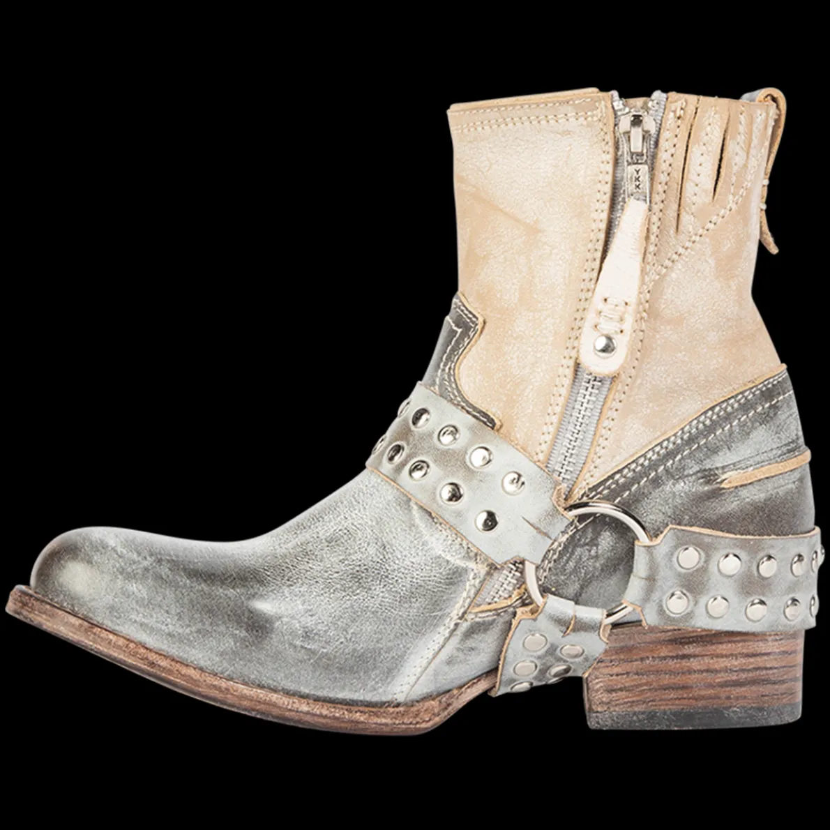 Ramone Is “Wanted” For Beingbold And Rebellious. This Full Grain Leather Ankle Bootie Is Constructed Witha Western Shaft Crown, Paired With An Outside Welt, Inside Zip Closure, And Embellished Harnessmaking Ramone A High Reward Item.