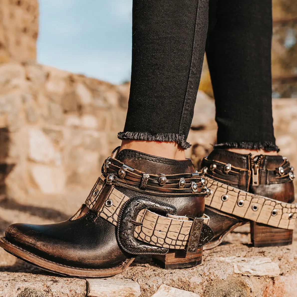 Bring The Wild West To The City Streets In The Saloon. With A Western-Inspired Silhouette, This Bootie Features A Small Front Cutout, A Slightly Curved Almond Toe, And An Inside Brass Zip Closure. Saloon Delivers Genuine Western Flair With Its Detailed Large Silver Buckle And Embellished Leather Belting.