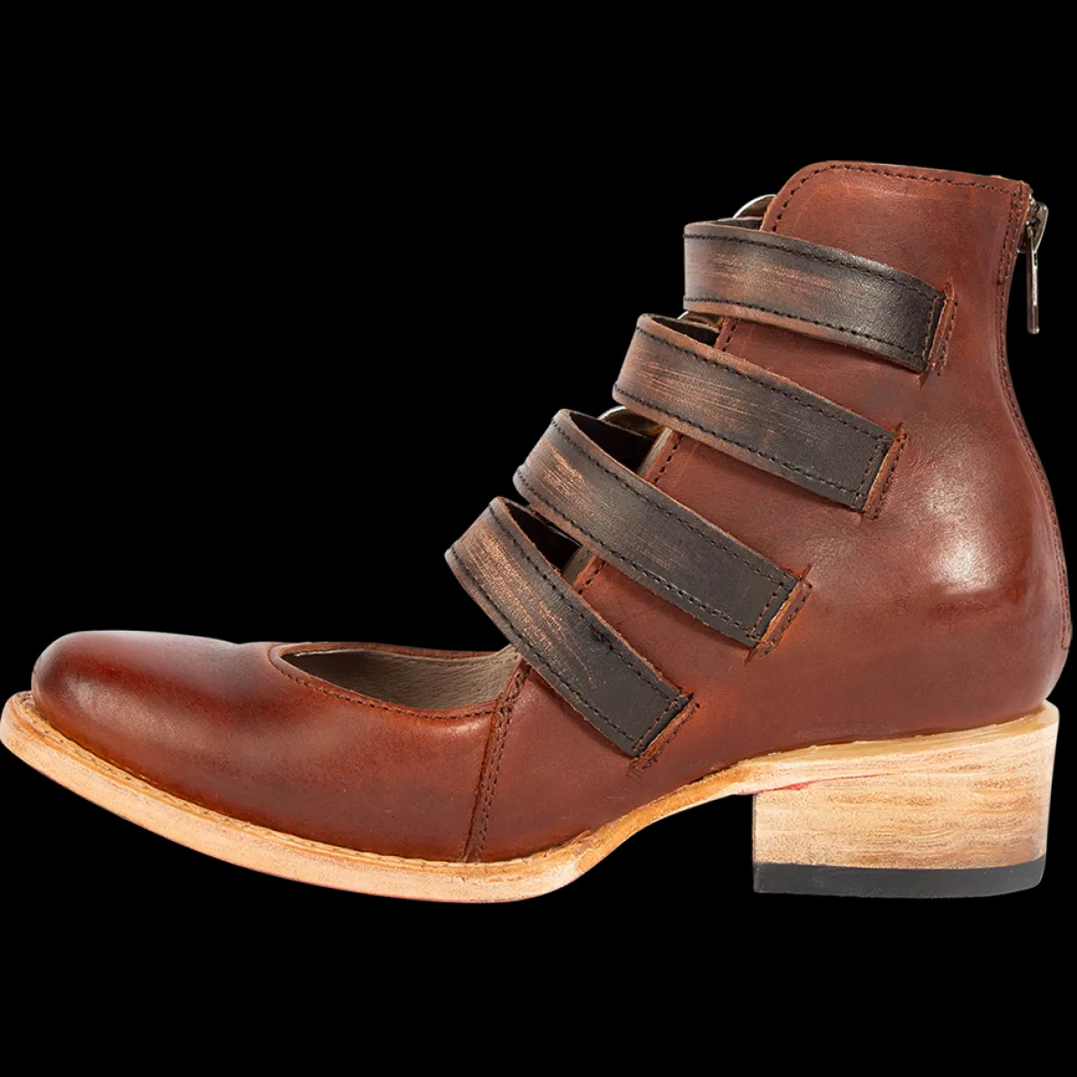 Take Your Shoe Game To The Next Level With The Scarlett. This Charming Low Heel Showcases An Exposed Instep With Four Adjustable Straps And Silver Western Hardware. Thoughtfully Designed With An Almond Toe And A Back Brass Zip Closure For Easy Wear.