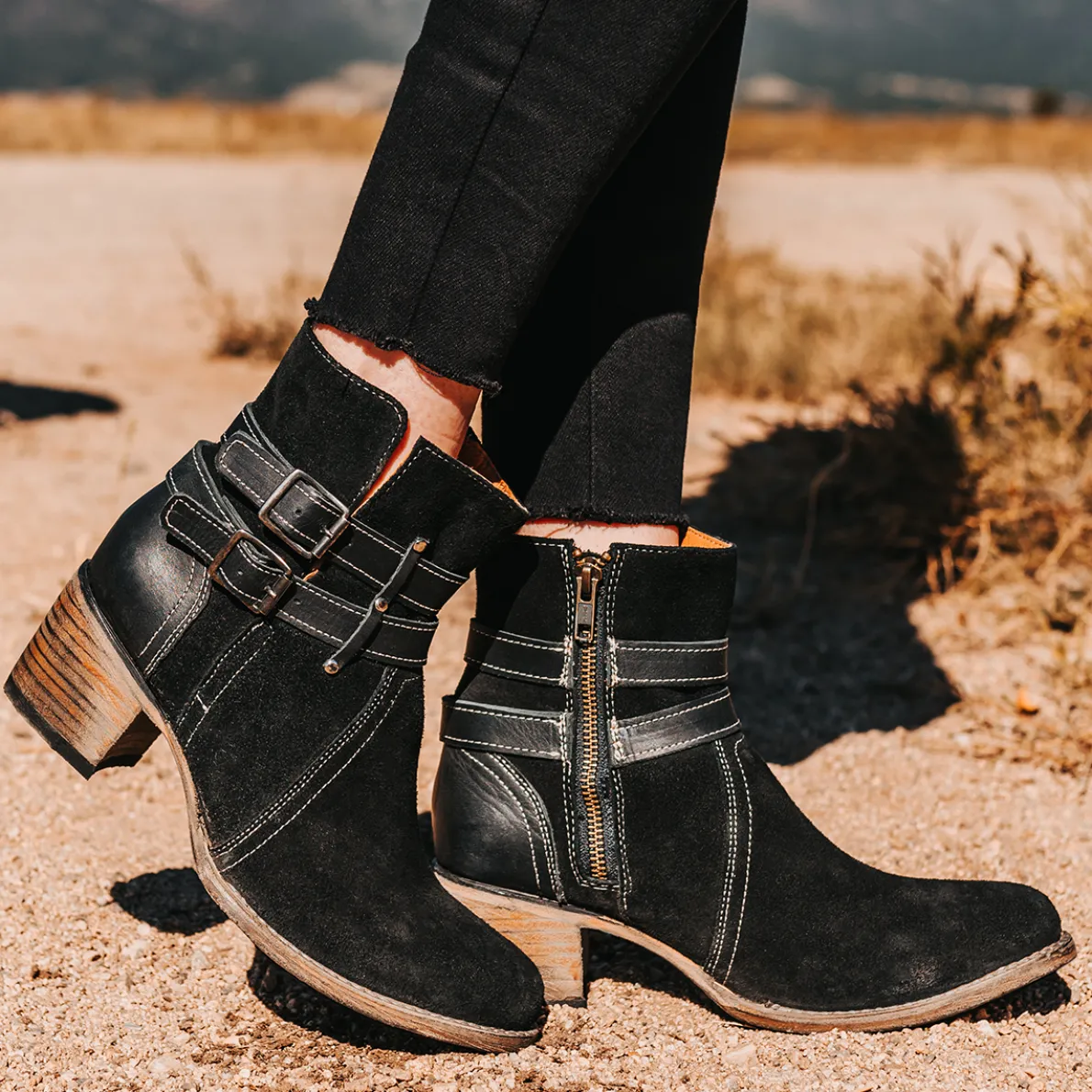 Shiloh Is Handcrafted With A Leather And Suede Uppercreatingan Artfully Balanced Ankle Bootie Designed With A Round Toe And Block Heel. Thisclassic Profile Is Furthered By Contrasting Stitching, Two Buckle Straps, And An Inside Zip Closure. Leather/Suede Upper, Leather Lining, Leather Sole Handcraftedin Mexico 2½” Heel Height 6″ Shaft Height 11″Shaft Circumference Measurements Taken From Us Size 8
