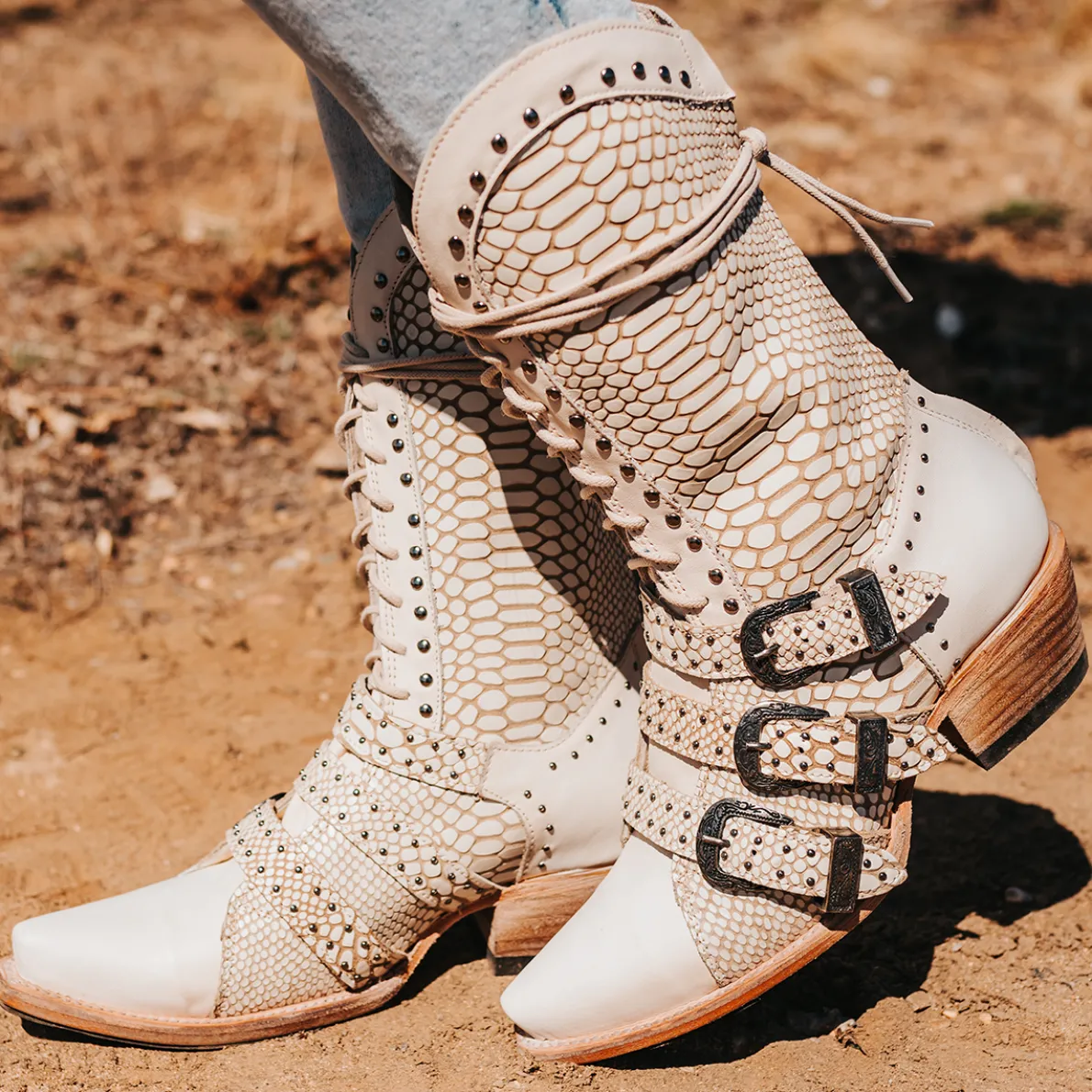Making An Entrance – Winnie. Multi-Leathers And Stud Detailing Create Dramatic Accents On This Western Mid-Calf Boot.Silver Engraved Buckles And Front Shaft Lacing Allow For A Personalized Fit And Complement The Snip Toe.