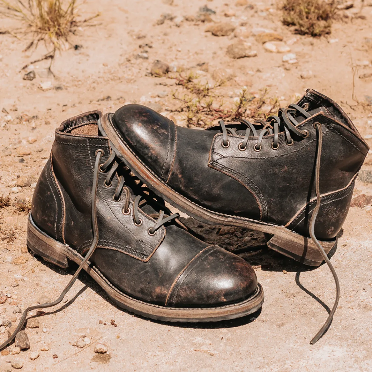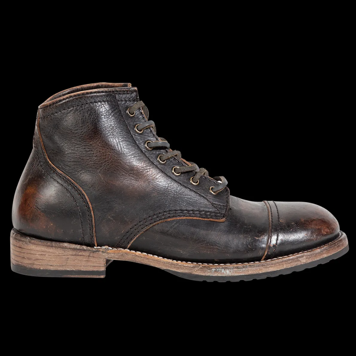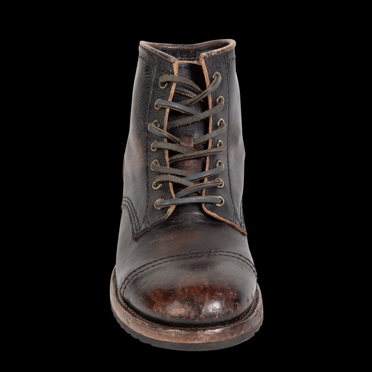 Leavenworth. This Distressedboot Was Handcrafted With 100% Full-Grain Leather And Features A Round Toe, Low Heel, And Adjustable Leather Lacing.