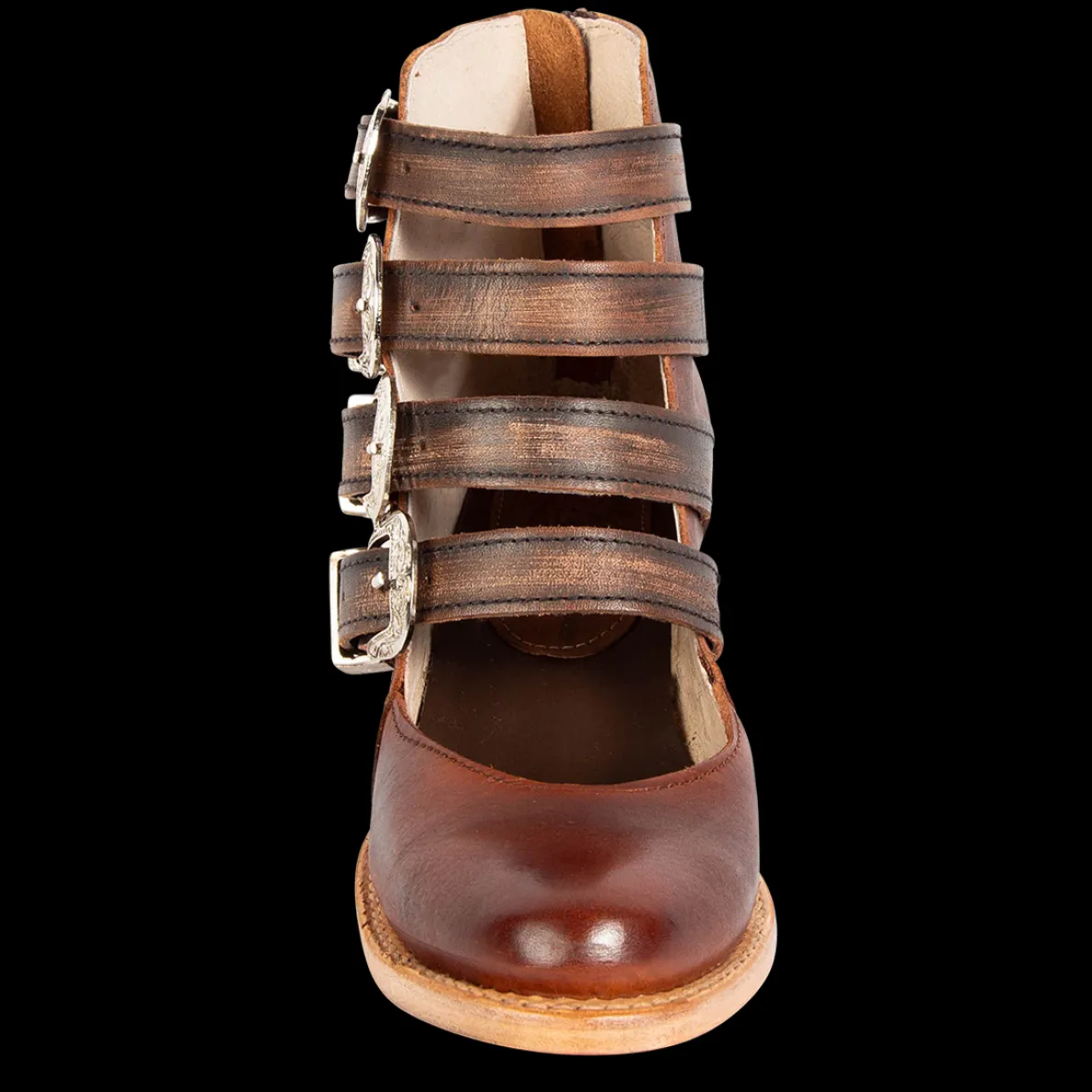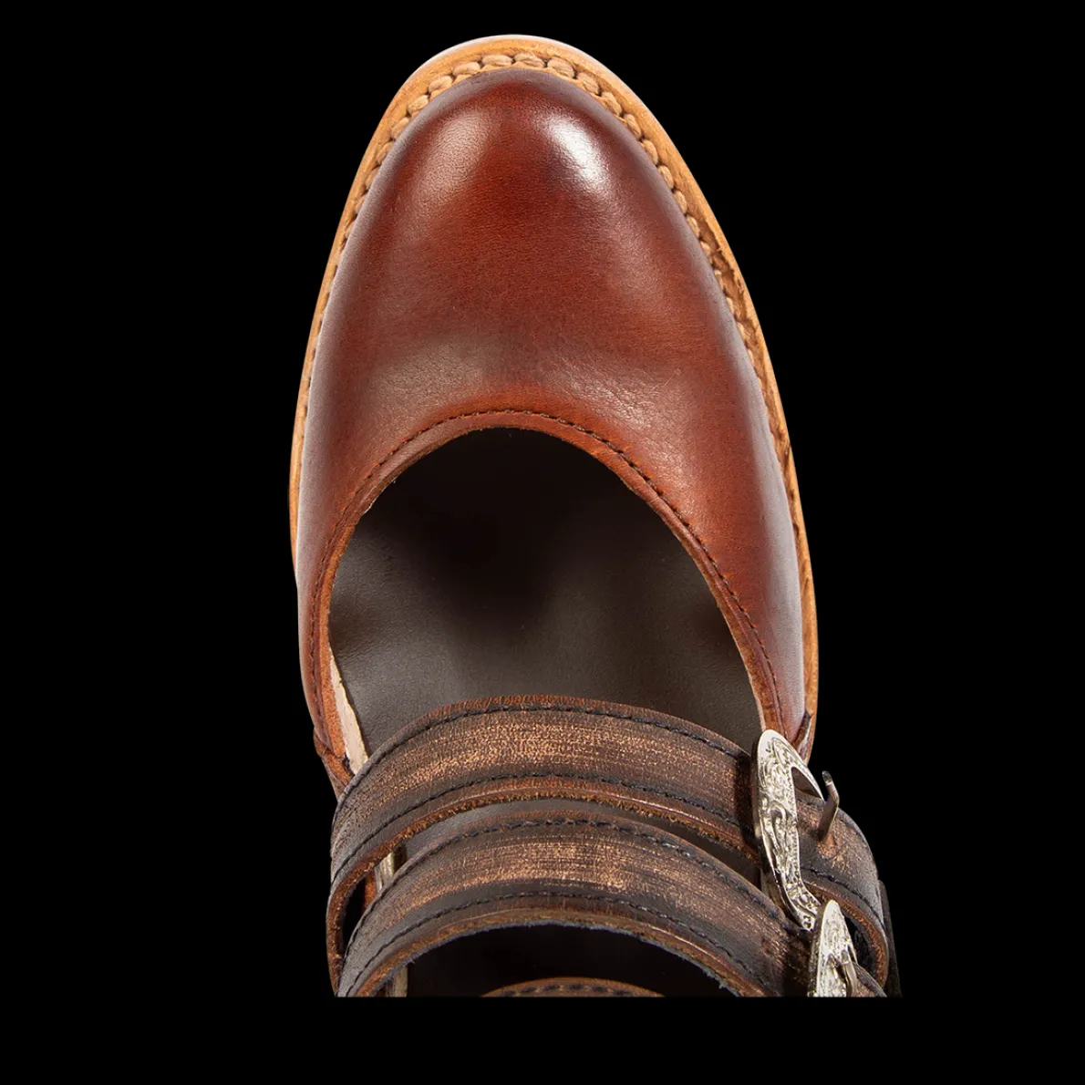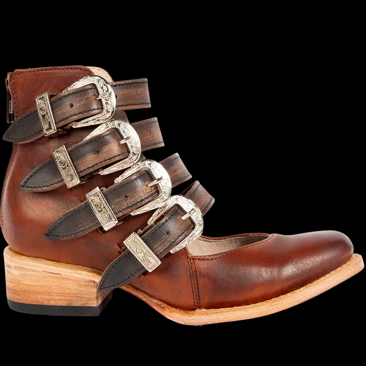 Take Your Shoe Game To The Next Level With The Scarlett. This Charming Low Heel Showcases An Exposed Instep With Four Adjustable Straps And Silver Western Hardware. Thoughtfully Designed With An Almond Toe And A Back Brass Zip Closure For Easy Wear.