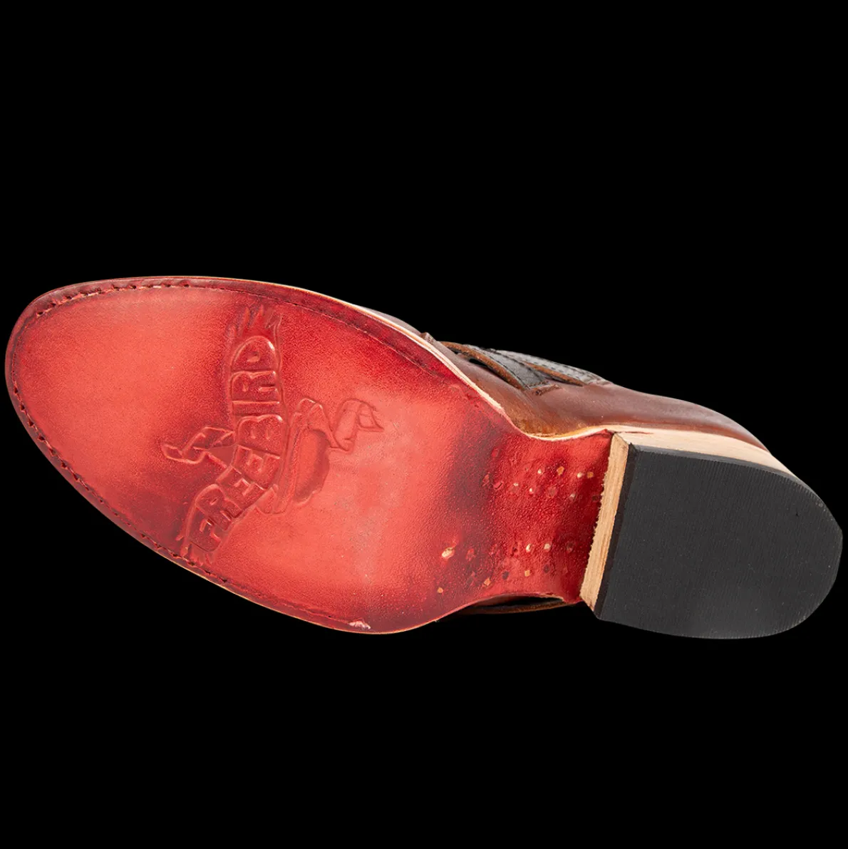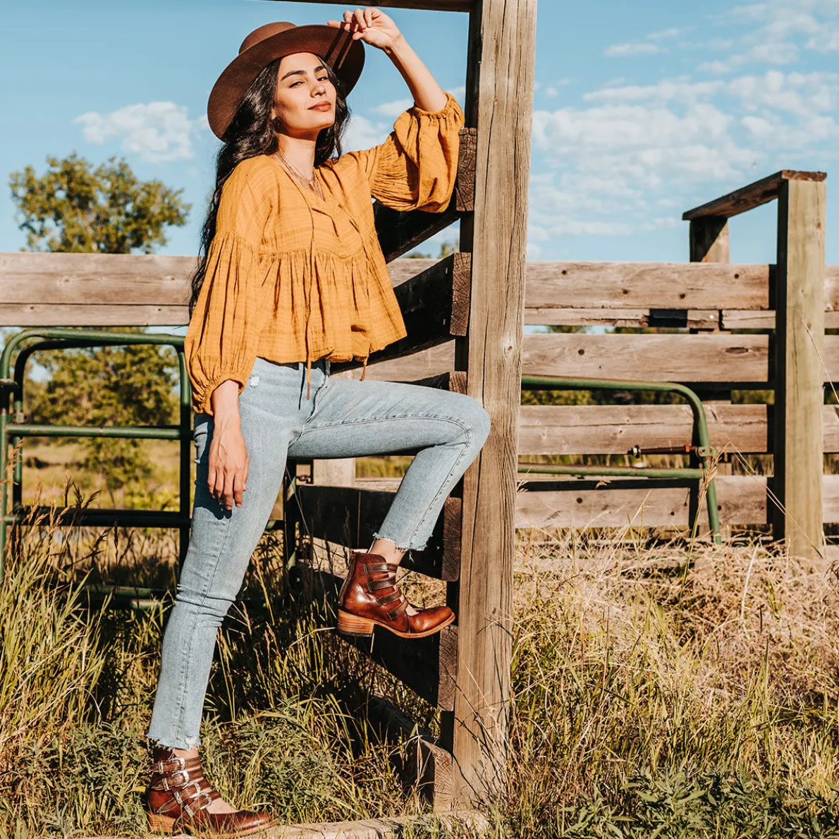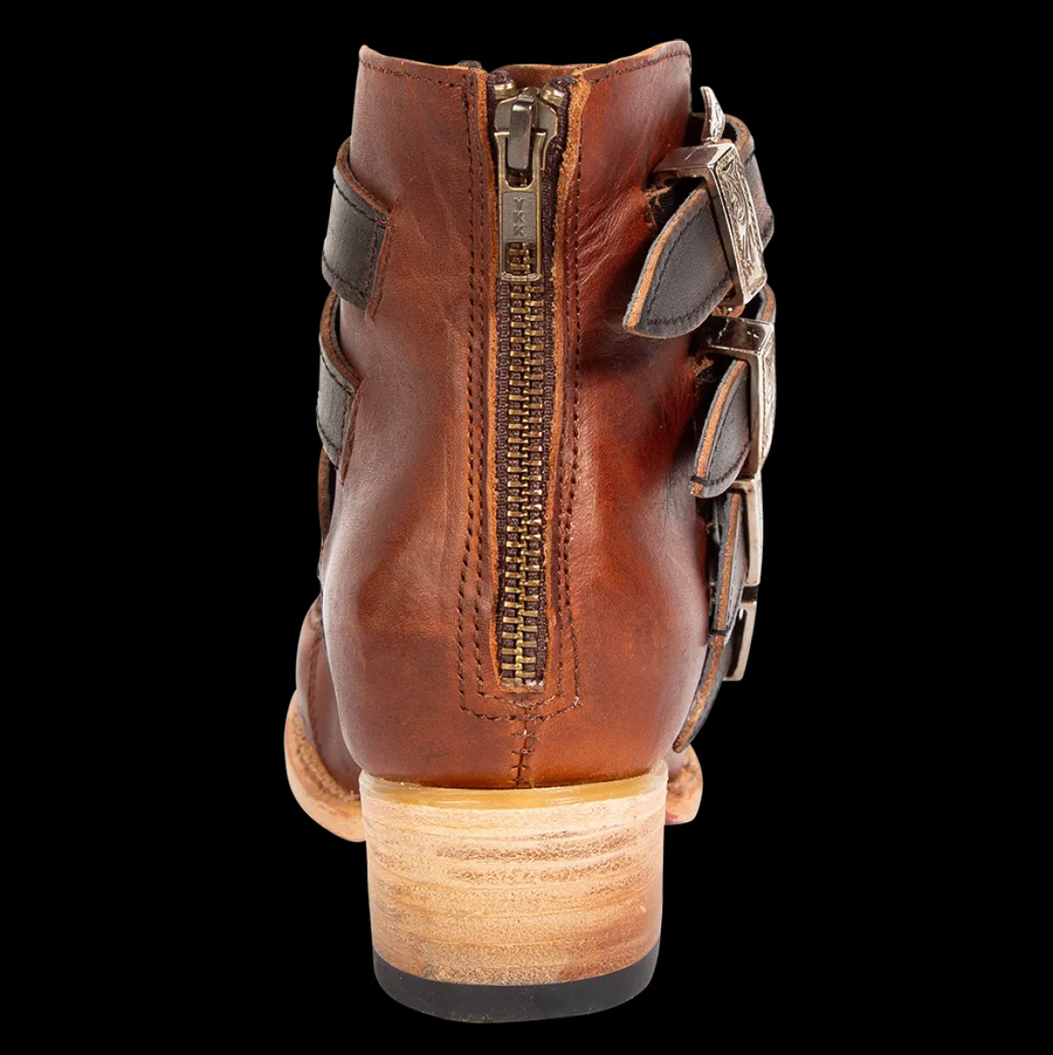 Take Your Shoe Game To The Next Level With The Scarlett. This Charming Low Heel Showcases An Exposed Instep With Four Adjustable Straps And Silver Western Hardware. Thoughtfully Designed With An Almond Toe And A Back Brass Zip Closure For Easy Wear.